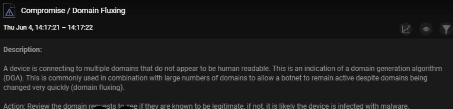 – Un monitoring temps réel sur la passerelle Internet. Les flux seront analysés, non seulement en termes d'autorisation du protocole, comme le fait un firewall, mais également par la cohérence de ce protocole par rapport au contenu et au volume échangé. Par exemple un protocole DNS va permettre de trouver l'adresse IP correspondant à un serveur d'un domaine donné que l'utilisateur veut joindre. Si la requête est étonnamment importante en taille ou en fréquence parce que la machine de l'utilisateur a effectué des centaines de requêtes en quelques secondes (domain fluxing), ou que le contenu des paquets DNS n'est pas lisible (binaire, exécutable, transfert de fichier), nous avons un problème potentiel. Une IA/ML nous aidera grandement, vu la volumétrie et la complexité des possibilités. On appelle ces outils des NDR: Network Detection & Response: