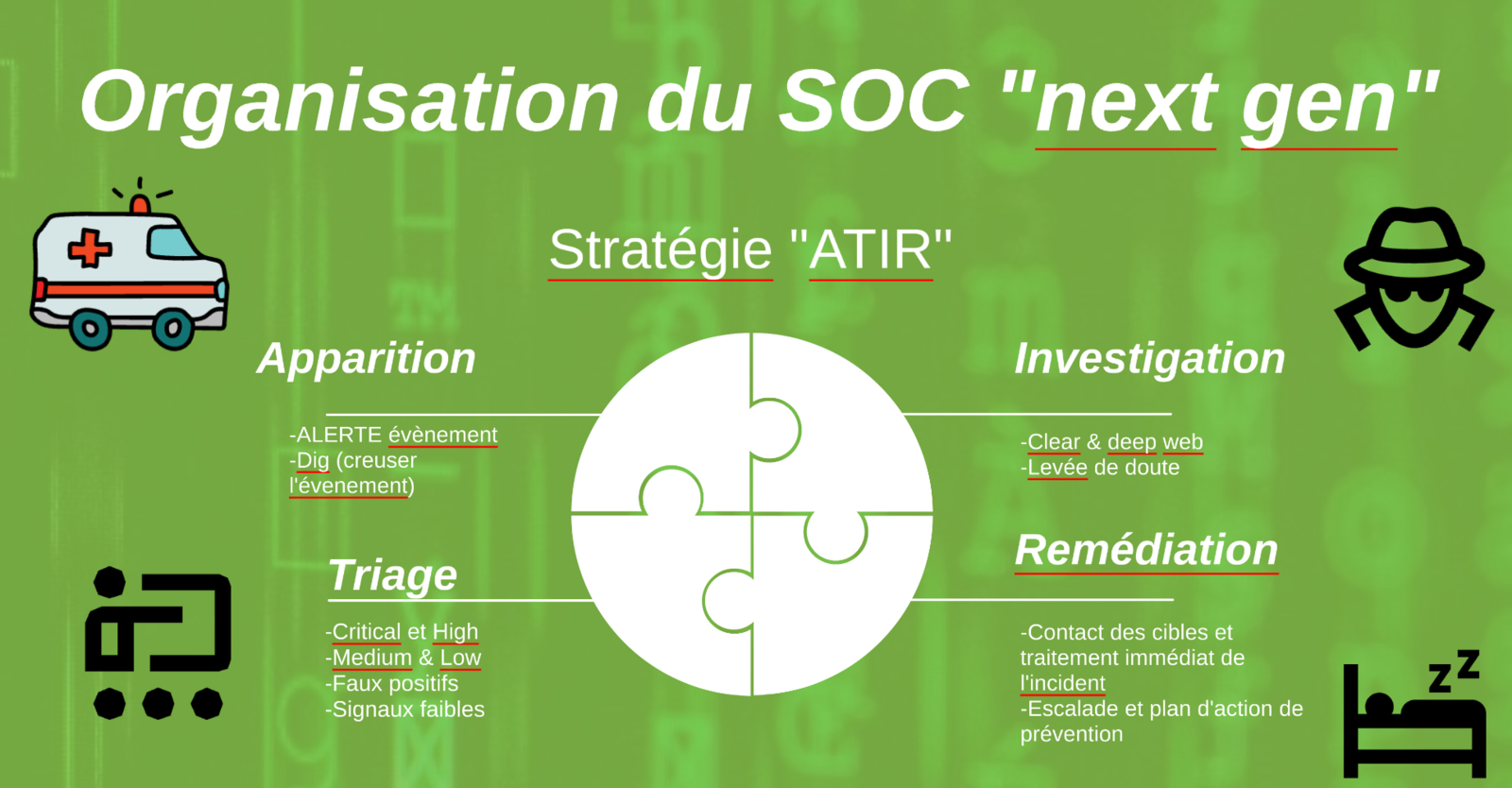 Mais malgré toutes nos précautions et la mise en place d'un système XDR, celui-ci ne sera efficace qu'à deux conditions: Il faudra que des humains (aidés par une IA/ML) analysent tous ces évènements et décident d'isoler, mettre en quarantaine, voire bloquer, la ou les machines infectées. Ce NSOC (Network and cyberSecurity Operation Center) va devoir intervenir très vite, 24h/24 et 7 jours/7 en pratiquant la stratégie "ATIR": Apparition d'un évènement anormal – Triage par criticité et urgence – Investigation – Remédiation. Voici donc le schéma typique d'un NSOC: