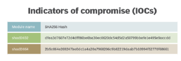 Ces IOC se présentent sous forme de hash (condensat) de "signature" typique de cette attaque permettant un format de transmission standardisé au niveau des composants de sécurité. Compte tenu des systèmes Windows, ils sont différents en fonction des processeurs 32 bits ou 64 bits, ce qui correspond également aux typologies d'attaque différentes.