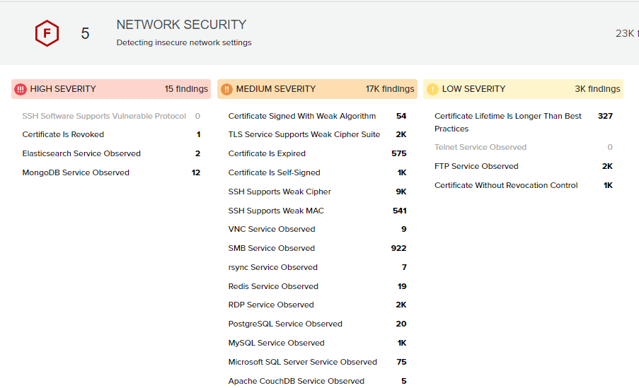 Un autre point que l’on voit clairement ici est le problème des certificats. Il y en a un qui est carrément révoqué, mais utilisé quand même. 54 ont un algorithme de chiffrement faible, 575 sont expirés, plus de 1000 sont auto-signés. Sans compter les 2000 protocoles TLS faibles et les quelque 9000 SSH (permettant un accès admin distant au serveur) faibles ! Pour rappel, les certificats contribuent au chiffrement, donc à la protection des flux réseau. Les attaquants utilisent clairement de faux certificats pour induire les utilisateurs ou les mécanismes de protection en erreur. Il faut donc repérer et éliminer tous ces certificats et algorithmes de chiffrement faibles.
