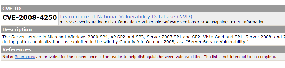 La "Common Vulnerability and Exposures" 2008-4250 correspond à faille de sécurité trouvée en 2008 dans Windows et qui affecte notamment Windows XP dont les correctifs de sécurité ne sont plus disponibles gratuitement depuis le 8 Avril 2014. Et pourtant, dans beaucoup d'entreprises, il existe encore de nombreux postes fonctionnant sous ce système.