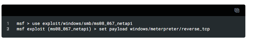 L'attaquant va alors repérer dans son scan que ces machines sous Windows XP n'ont pas le patch en question et il va exécuter alors son code d'attaque grâce à Metasploit: